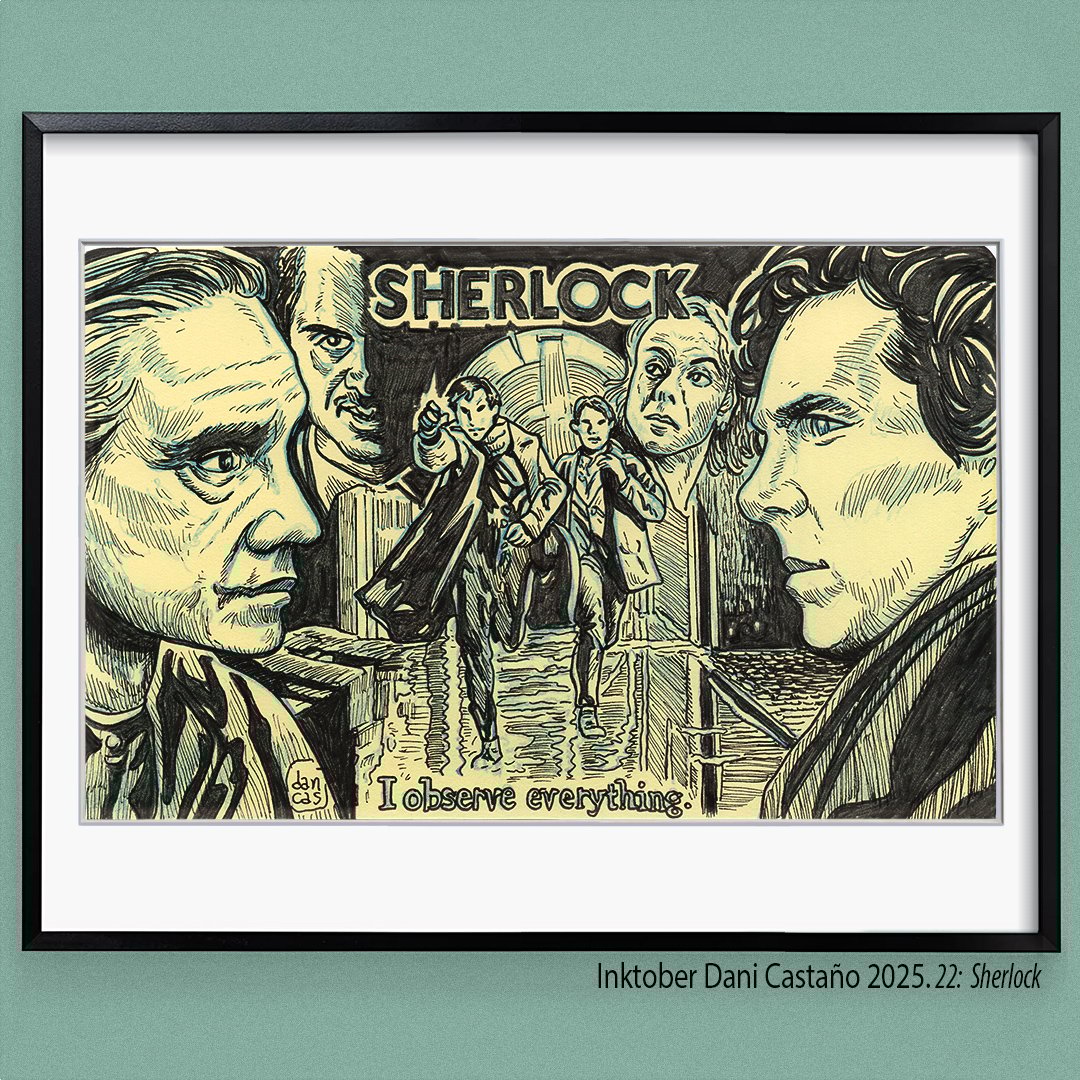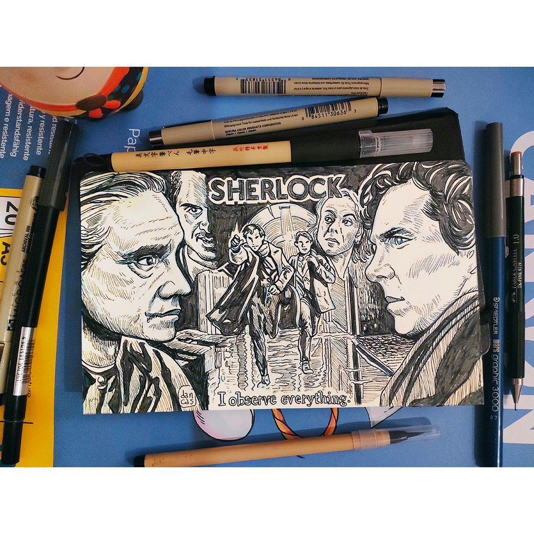 Ilustración original sobre la serie Sherlock, tamaño aproximado A5 (21x13cm), tinta sobre papel de 100 gramos satinado.